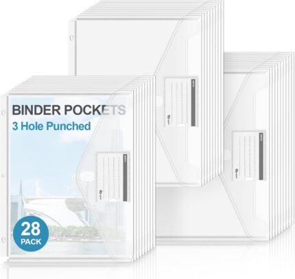 3 Ring Binder Pocket,28 Pack Heavyweight Plastic Folder with Hook and Loop Closure,Letter Size clear Poly Envelope with Pockets and label,Binder Organizer Side Loading for School Office Supplies