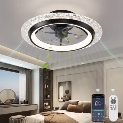 KINDLOV Modern Ceiling Fans with Lights, 19.7″ Flush Mount Ceiling Fan with Dimmable Light and Remote,6-Speed Wind for Bedroom,Living Room,Low Profile Ceiling Fan with Light,Black