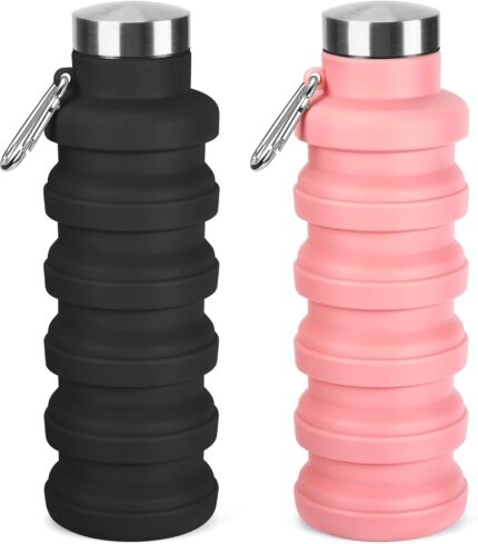 Collapsible Water Bottles 17oz, Portable Leak-Proof Travel Water Bottle, Reusable BPA Free Silicone Foldable Water Bottle with Carabiner for Gym, Traveling, Camping, Hiking, Sports(Black+Pink)