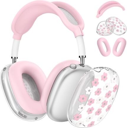 Silicone Case for AirPods Max Headphones, Clear Flower Soft TPU Ear Cups Protector, Headband Cover for AirPod Max, Transparent Protector for Apple AirPods Max (2024/USB-C) for Women, Pink