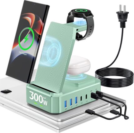 300W Charging Station for Multiple Devices Apple, Zutspzss 10 in 1 Wireless Charger for iPhone 16, GaN III USB C 65W PD Fast Charging Stand Dock for MacBook, Apple Watch&Airpods,Green