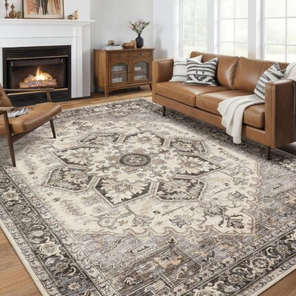 Area Rug for Living Room – 9×12 Soft Machine Washable Oriental Vintage Floral Distressed Large Indoor Floor Carpet for Bedroom Under Dining Table Home Office Decor – Grey Brown