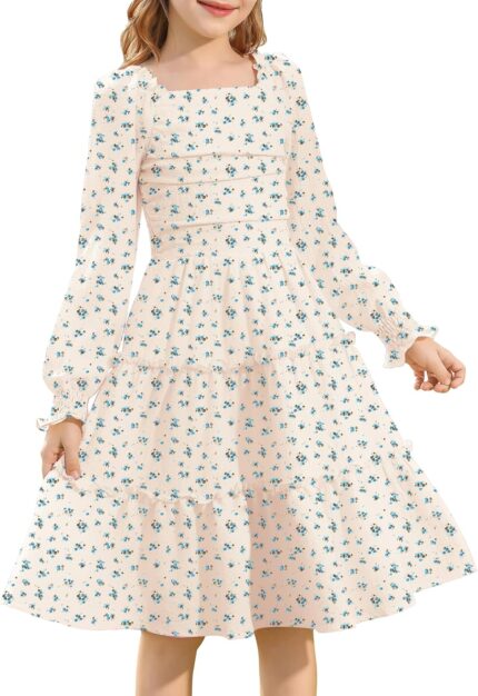 HOZIY Girls Long Sleeve Dress Ruched Smocked Tiered Ruffle A-Line Casual Boho Teen Dresses with Pocket Size 6-16 Years