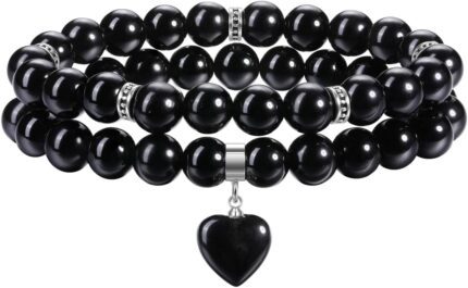 Jovivi 2pcs Healing Crystal Beaded Bracelets for Women,8mm Natural Gemstones Amethyst Stone Bracelet,Anxiety Stress Relief Heart Charm Bracelet Handmade Jewelry Gifts for Her