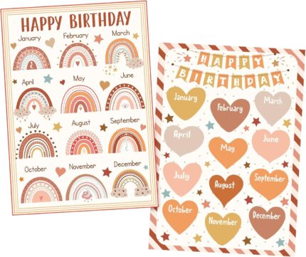Spakon 2 Pack Boho Happy Birthday Poster Chart for Classroom Birthday Calendar Poster Chart Classroom Decoration Bulletin Board Decor, 12.4 x 17.5 Inch(Boho)