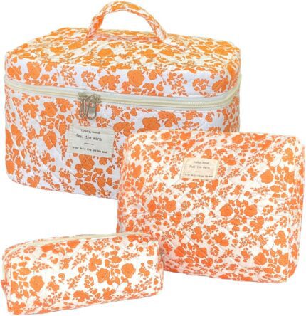 Orange Large Quilted Floral Makeup Bag Set of 3 Cute Coquette Aesthetic Cosmetic Bag Set Travel Toiletry Bag for Women