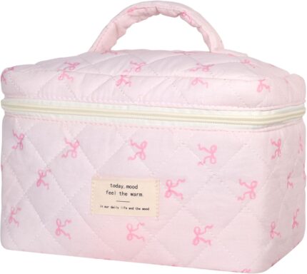 Quilted Makeup Bag, Large Makeup Bag, Cute Cosmetic Bag for Women Girls, Floral Coquette Aesthetic Travel Toiletry Make Up Organizer Bag-Light Pink