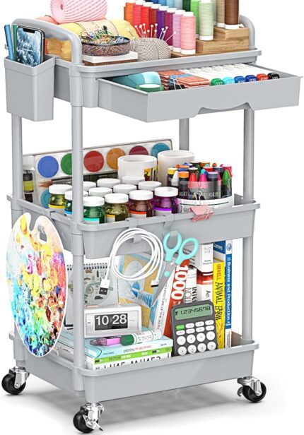 3 Tier Rolling Cart with Drawer, Bathroom Storage Organizer with 2 Lockable Wheels, Multifunctional Rolling Storage Cart for Bathroom, Kitchen, Office, Craft, Makeup, Baby Essentials, Gray
