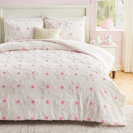 VIVILINEN Twin Comforter Set for Girls 2 Pieces Twin Size Pink Floral Bedding Set Cute Comforter with Tufted Daisies Flowers, Lightweight Bed Set for Kids Teen Girls Women