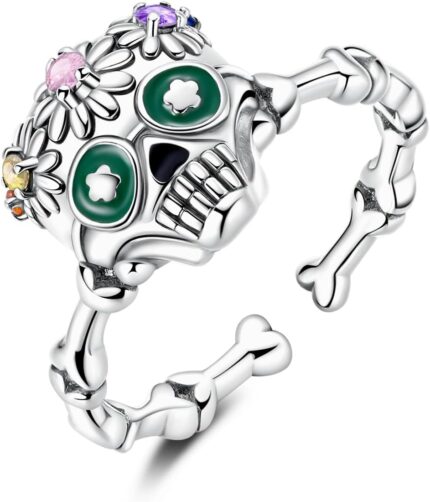 Hapour Adjustable Halloween Rings for Women S925 Sterling Silver Stackable Open Eternity Band Skull Skeleton Rose Flower Rings
