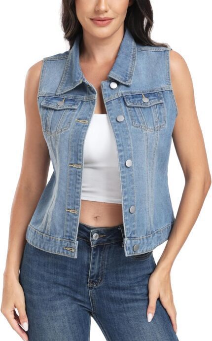 MISS MOLY Women’s Denim Vest Cropped Classic Sleeveless Jean Vest Jackets With Flap Pockets