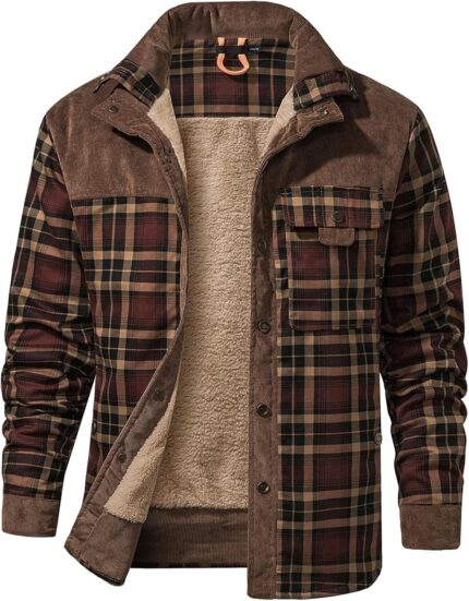 Gihuo Men’s Long Sleeve Sherpa Lined Shirts Outdoor Warm Flannel Plaid Jacket Button Down Fleece Coats