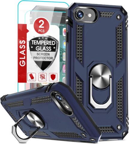 LeYi iPhone SE 2022/2020 Case With [2Pack] Tempered Glass Screen Protector, Military-Grade Protective Phone Case With Magnetic Metal Kickstand for SE 3rd/2nd Gen, Blue