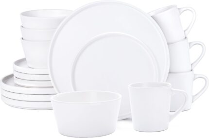 Amazon Basics 16-Piece Porcelain Kitchen Dinnerware Set with Plates, Bowls and Mugs, Service for 4 – White