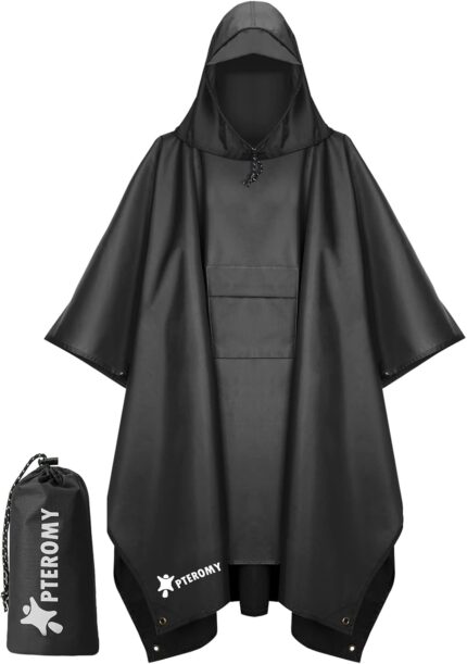 PTEROMY Hooded Rain Poncho for Adult with Pocket, Waterproof Lightweight Unisex Raincoat for Hiking Camping Emergency