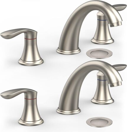 Bathroom Sink Faucet, Faucet for Bathroom Sink, Widespread Brushed Nickel Bathroom Faucet 3 Hole with Stainless Steel Pop Up Drain and cUPC Lead-Free Hose – (Brushed Nickel)