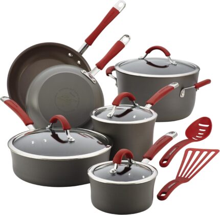 Rachael Ray – 87630 Rachael Ray Cucina Hard Anodized Nonstick Cookware Pots and Pans Set, 12 Piece, Gray with Red Handles