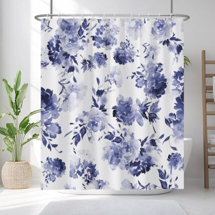 Renaiss 72×72 Inches Navy Blue Floral Shower Curtain Watercolor Flowers Blossom Leaves Plant Bath Curtain Fabric Shower Curtain for Bathroom Decor Set Polyester Waterproof with Hooks