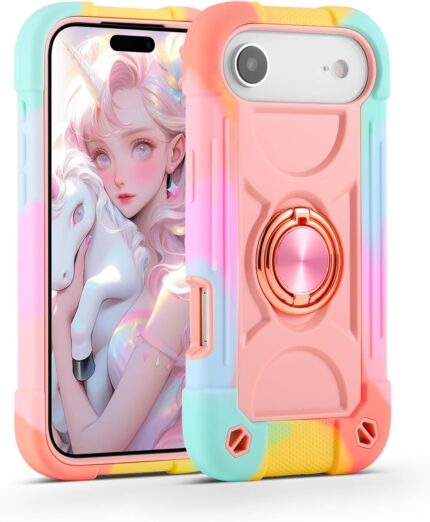MARKILL Compatible with iPhone Air Case 6.5 Inch 2025 with 360 Degree Rotate Ring Stand, Military Grade Drop Protection Full Body Rugged Protective Case Kids (Rainbow Pink)