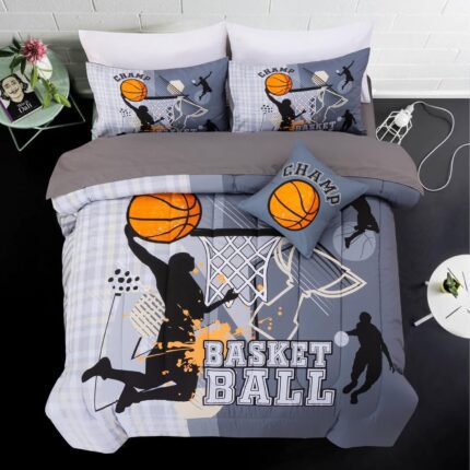 A Nice Night Twin Comforter Set 6 Piece Bed-in-a-Bag with Comforter & Sheet Set for All Seasons,Basketball Court with Sportsman Slam Dunk Printing for Kids Teen Boys,Gray