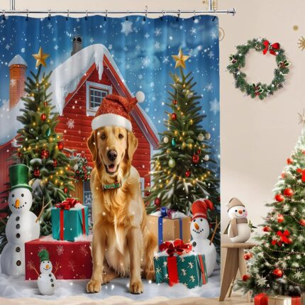 Winter Christmas Shower Curtain Funny Golden Retriever Dog Snowman Pine Tree Xmas Tree Ball Snowflake Rustic Farmhouse Nature Snow Scenery Holiday New Year Bathroom Curtain with Hook