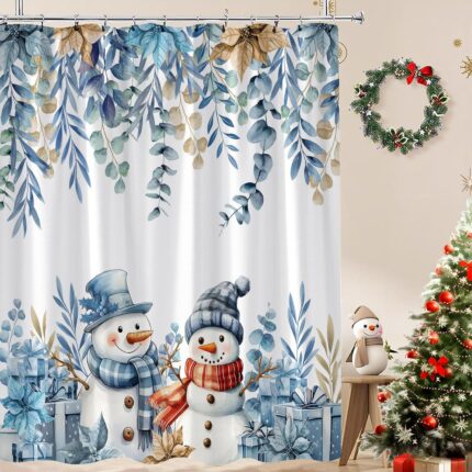 Winter Snowman Christmas Shower Curtain Cute Blue Snowman Snowflake Poinsettia Floral Eucalyptus Leaves Plant Holiday Happy New Year Fabric Bathroom Curtain Set with Hook