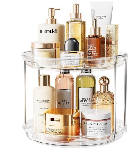 LAMU Rotating Makeup Organizer for Vanity, 10.6in 2 Tier Lazy Susan Turntable Stackable Spinning Skincare Organizer Cosmetic Perfume Tray Display for Bathroom Counterop, Large Capacity, Clear