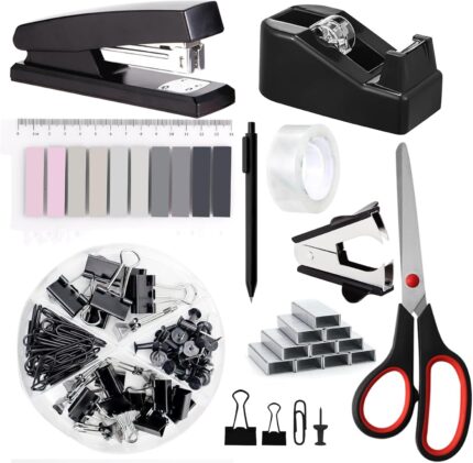 Office Supplies,Desk Accessories, Stapler and Tape Dispenser Set for Women with Stapler, Tape Dispenser, Staple Remover, Staples, Clips, Scissor and Tabs,Gift for Students, Coworkers