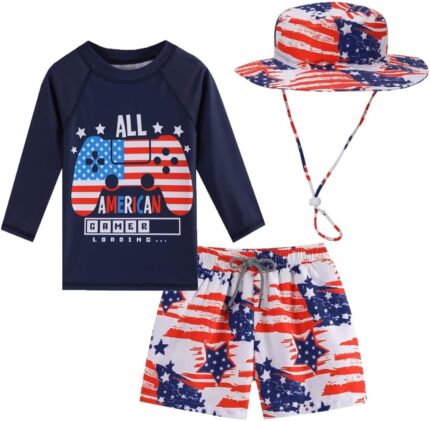 Price: (as of – Details) Toddlers and Baby Boys’ Swimsuit Trunk Rashguard and Sun Hat Set, Multipacks Baby Toddler Boy