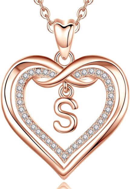 Vito Rosed Gold Initial Necklaces for Women, CZ Double Heart Letter A to Z Pendant Neckless Dainty Infinity Alphabet Jewelry Gift, 18″
