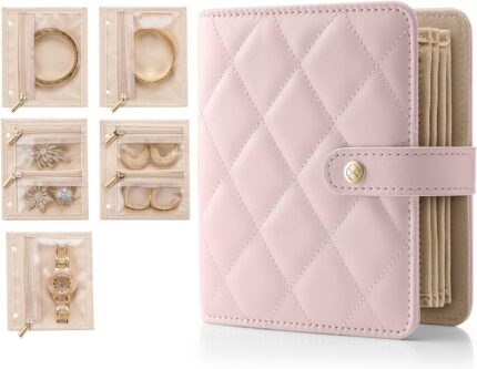 Vlando Small Jewelry Book Organizer – Leather Travel Jewelry Case with 5 Detachable Pages for Necklaces, Rings, Earrings, Tangle-Free, Giftable,Barely Pink