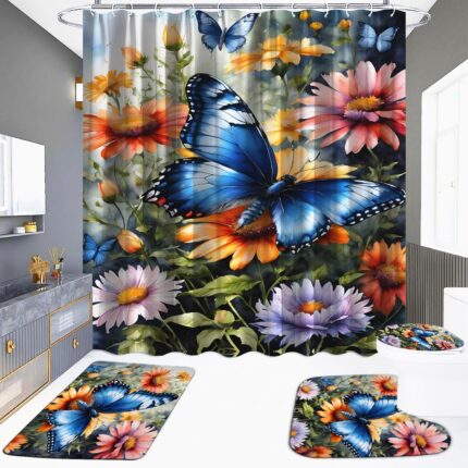Butterfly Flower Shower Curtain and Rugs Bathroom Set Watercolor Nature Scenery Plant Floral Shower Curtains Waterproof Polyester Wildflower Botanical Bath Curtain Mat Toilet Restroom Home Accessories