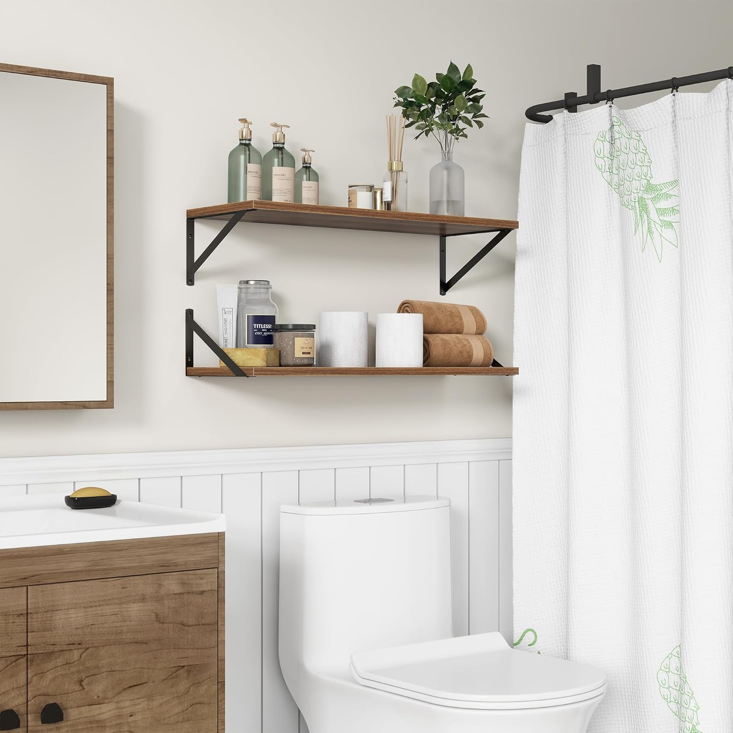 【DECORATIVE & FUNCTIONAL】The wall-mounted floating shelves are designed for decoration and storage, utilizing and decorating any space in your home. Used as shelf decor to show your collection, books, or prize, the hanging shelves are perfect for displaying your photo frame, small plants, model, or audio in your living room, office, study. And can also use as over the toilet storage shelf in the bathroom to hold toiletries or used as kitchen shelf to storage condiments.