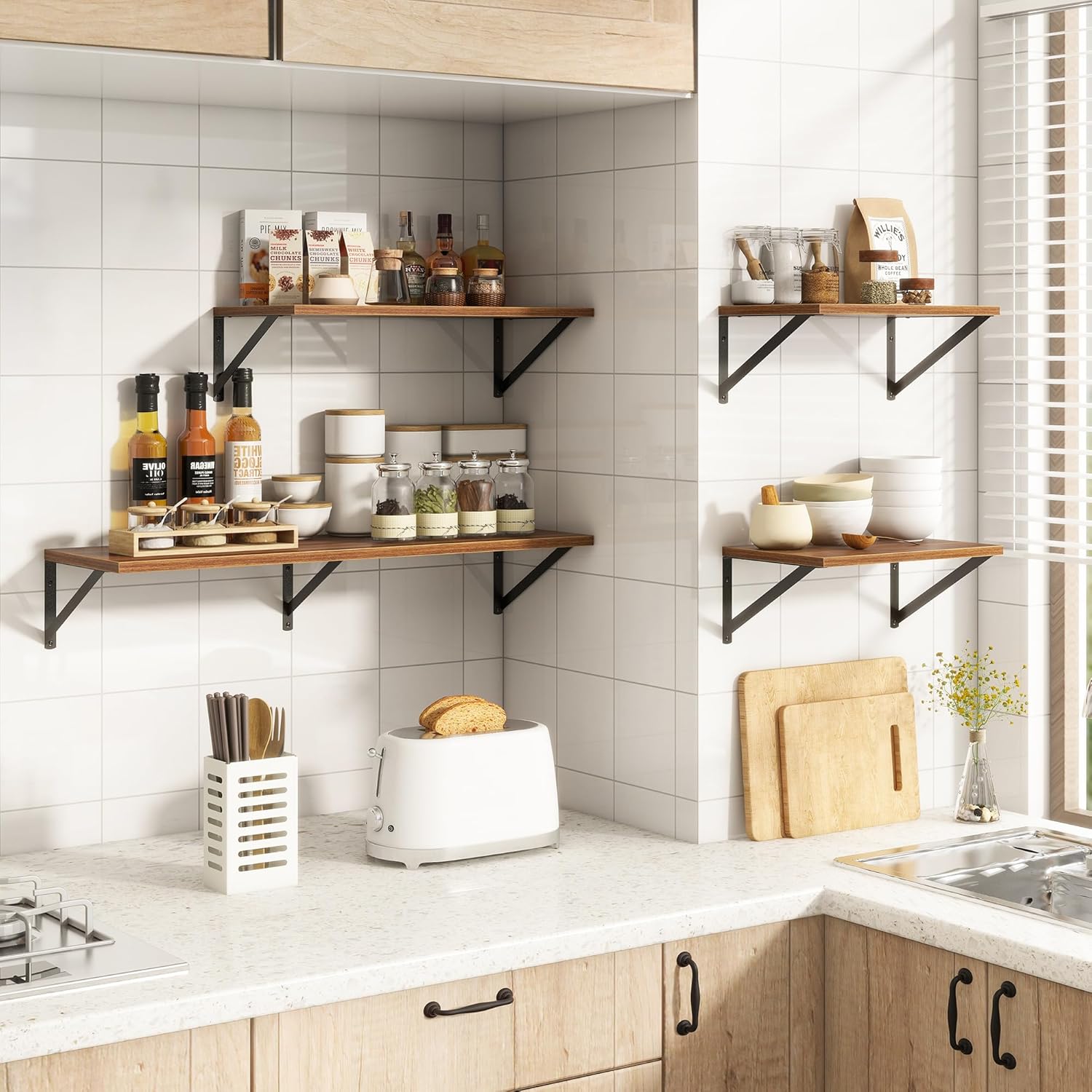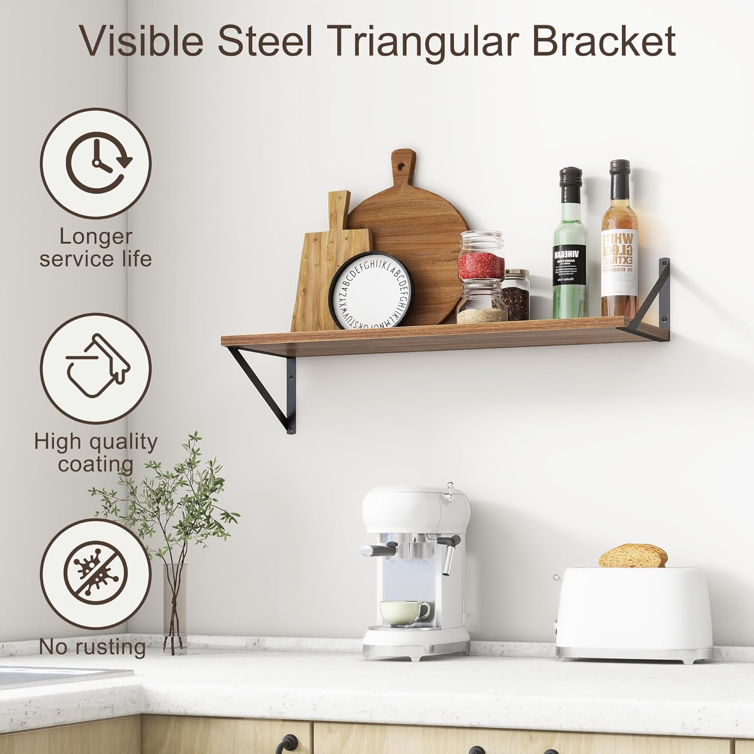 【FARMHOUSE RUSTIC WALL SHELF】These floating shelves are made of premium engineered wood board and visible triangular bracket. The rustic wooden grain surface add character and warmth to any modern or traditional interior with these deep floating shelves, contrast shelves at staggering heights on the wall or mount side-by-side or in the corner for a clean streamlined look.