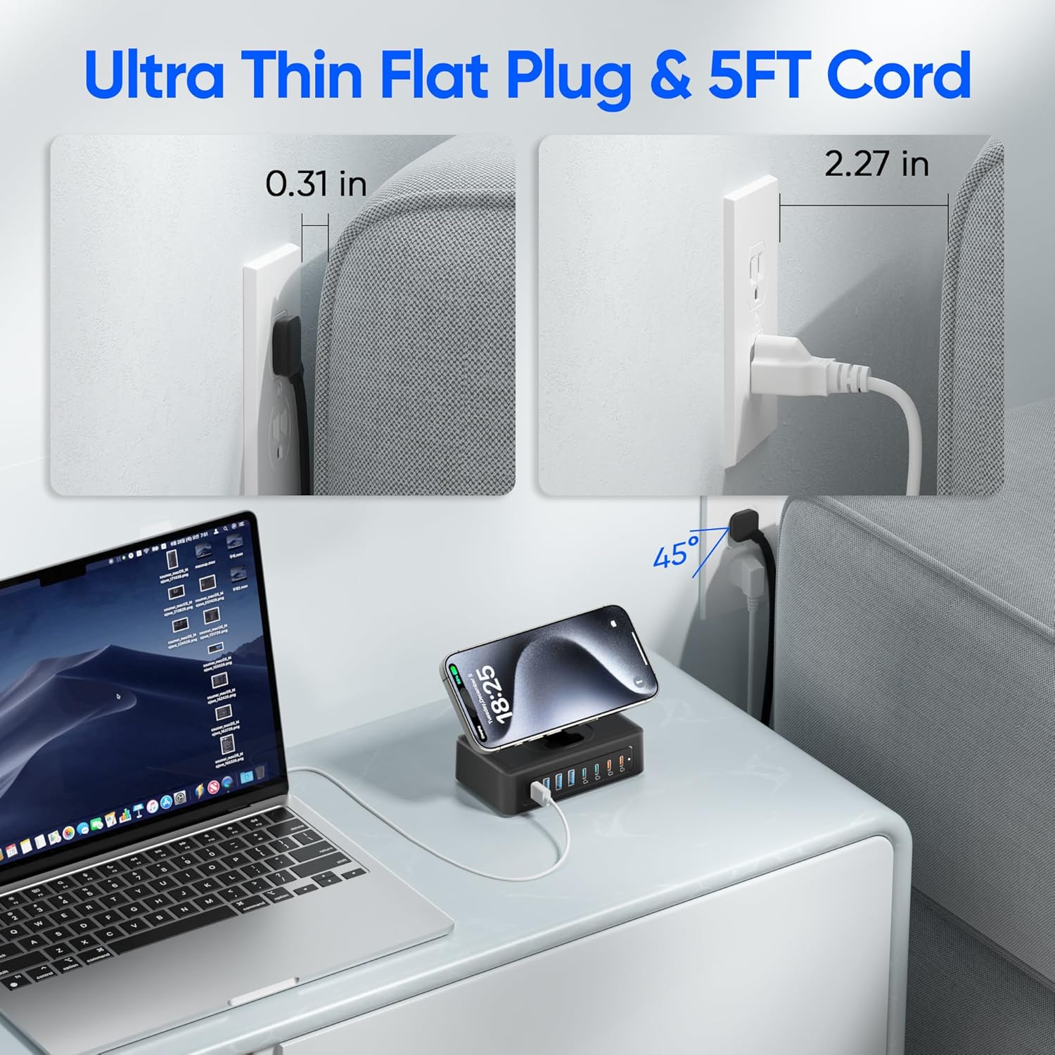 【5FT Flat Plug Extension Cord & Traveling Portable】USB Power Strip incorporates a 0.31in ultra thin flat plug and 5ft extension cord. Flat plug can easily close to the wall and hide behind sofa or other furniture. The compact size is easy to fit into a bag or backpack and is suitable for home, office and travelling.