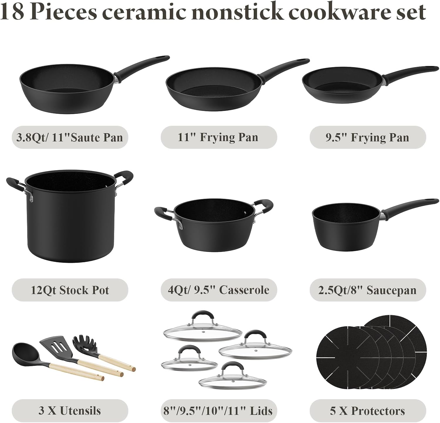 Versatile Cookware Set: Includes 12-quart stock pot with lid, 4-quart (9.5-inch) casserole with lid, 3.8-quart(11-inch) saute pan with lid, 2.5-quart (8-inch) saucepan with lid, 11-inch frying pan, 9.5-inch frying pan and essential utensils, ensuring you’re equipped for all cooking needs