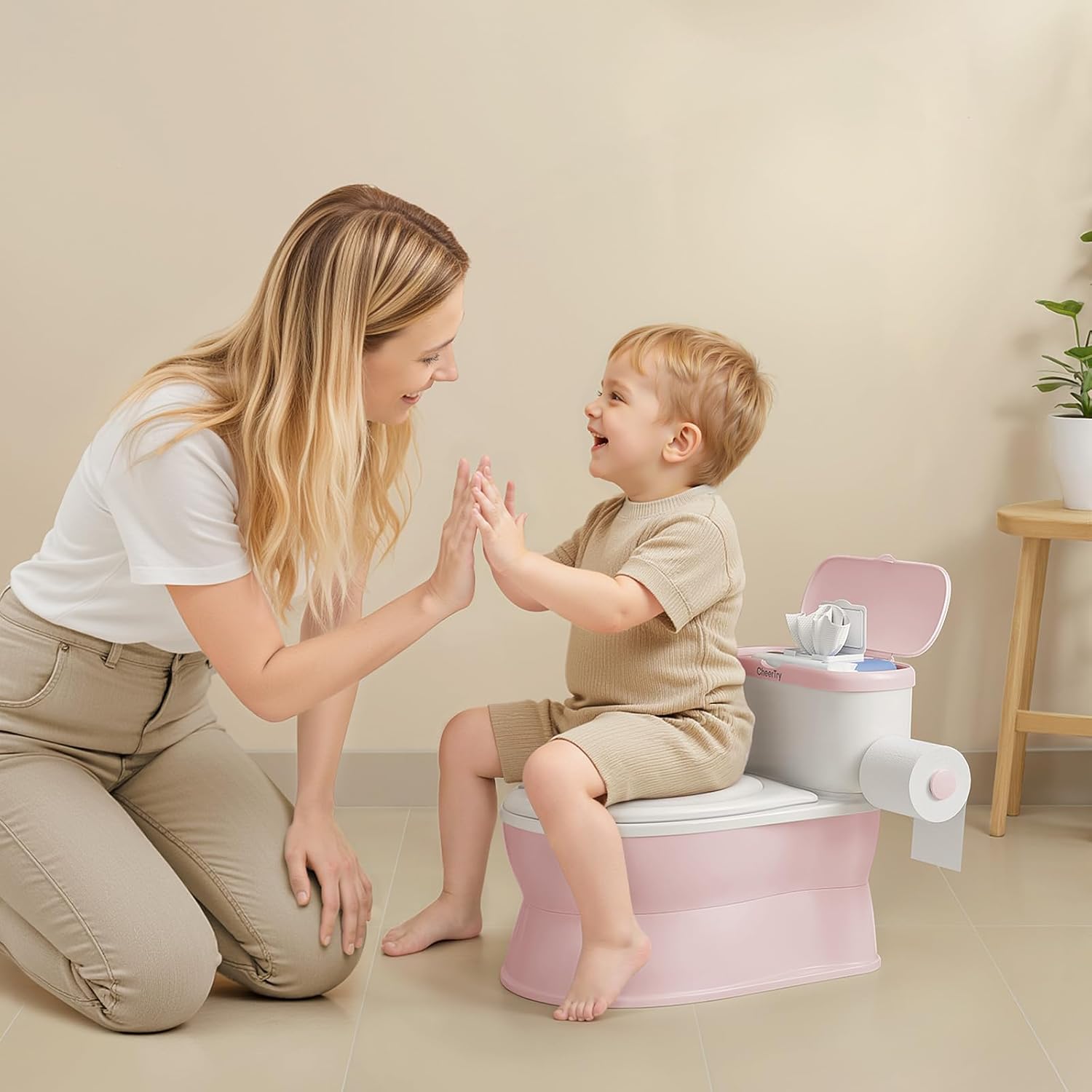 Convenient Storage — The roomy tank holds wipes or little toys, and the side has a pull-out toilet paper holder so everything’s within reach, helping toddlers get the hang of the full potty routine