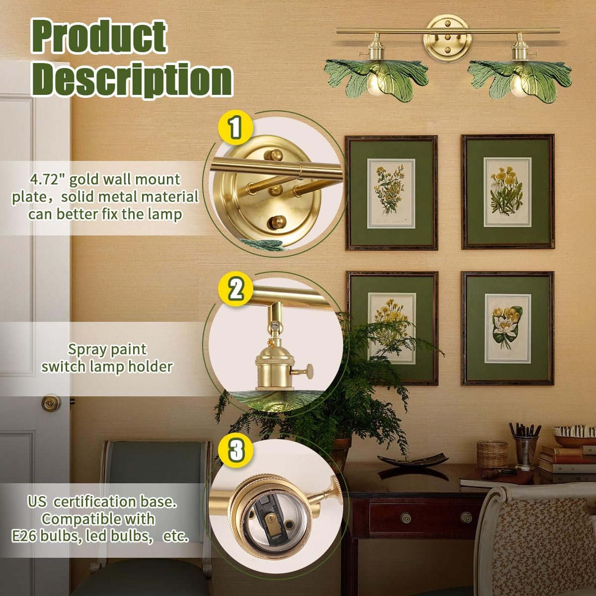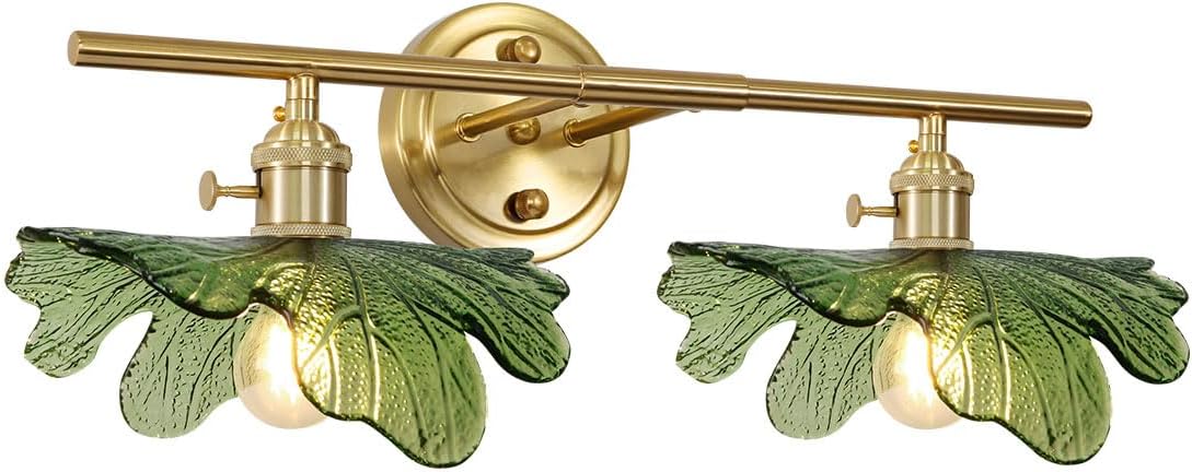 2 Light Bathroom Lighting Fixtures Over Mirror, Vintage Wall Sconces with Glass Shade Green Vanity Lights Mid Century Wall Sconce Light Gold Wall Lighting for Bedroom Living Room Hallway