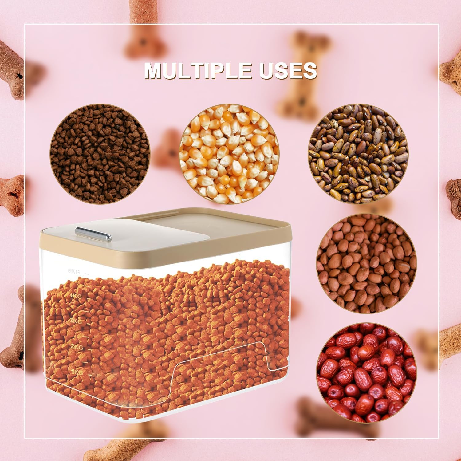 This dog food container can hold up to 10 lbs, allowing you to store different types of food or keep a backup supply, keeping everything organized and tidy.