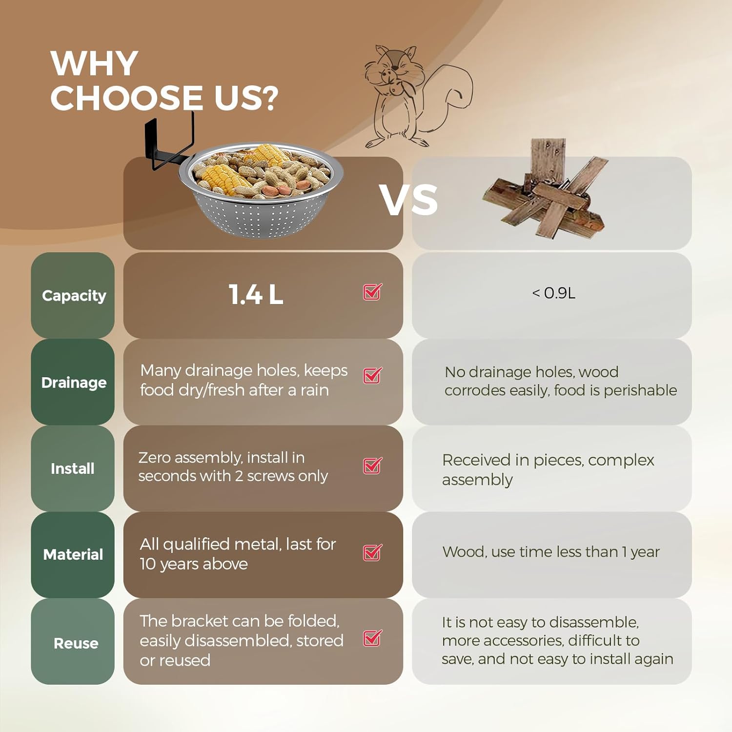 【Easy Clean + Removable Bowl 】Both squirrel metal bowls are removable. Stainless Steel bowl material + removable features make them quite easy to clean and refill, saving your time and energy