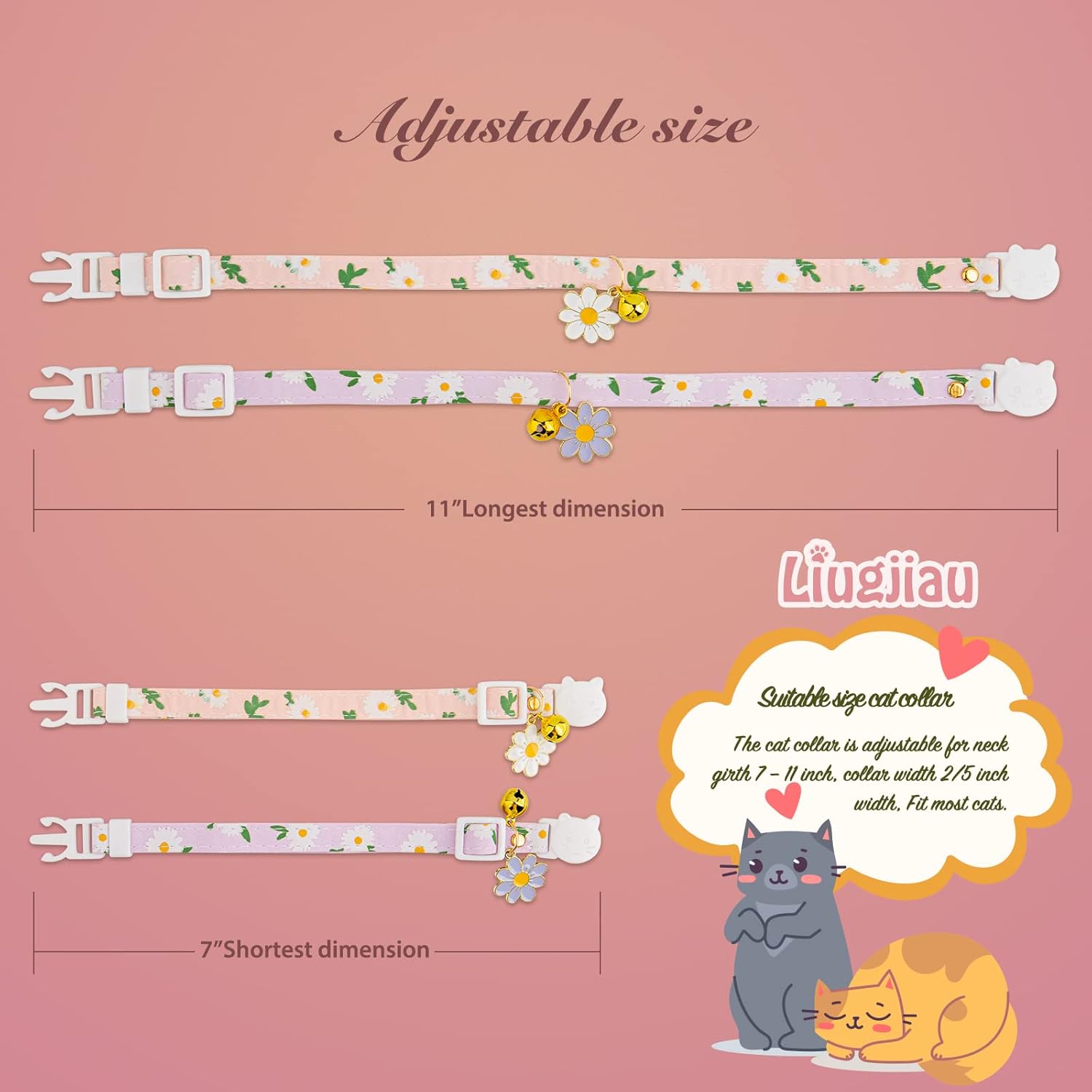 Adjustable Size:Our cat collars are adjustable from 7-11″ inch with a width of 2/5″ inch, perfect for your little kitten or adult cat,please measure your pet’s neck circumference before purchasing to ensure the collar fits properly
