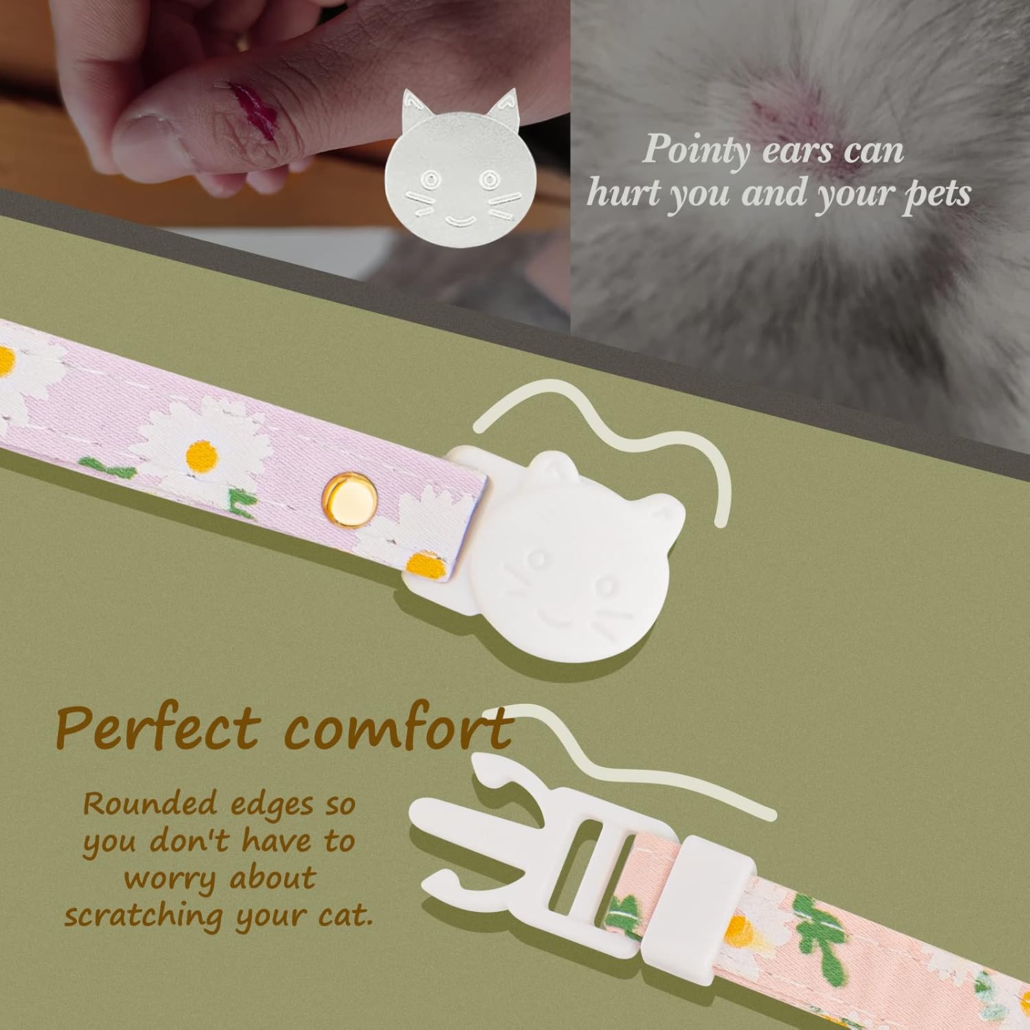 In order to prevent your cat from being scratched, we did not use the pointed ear buckle design on the market, but the round ear design, which can well protect the cat’s neck from being scratched.