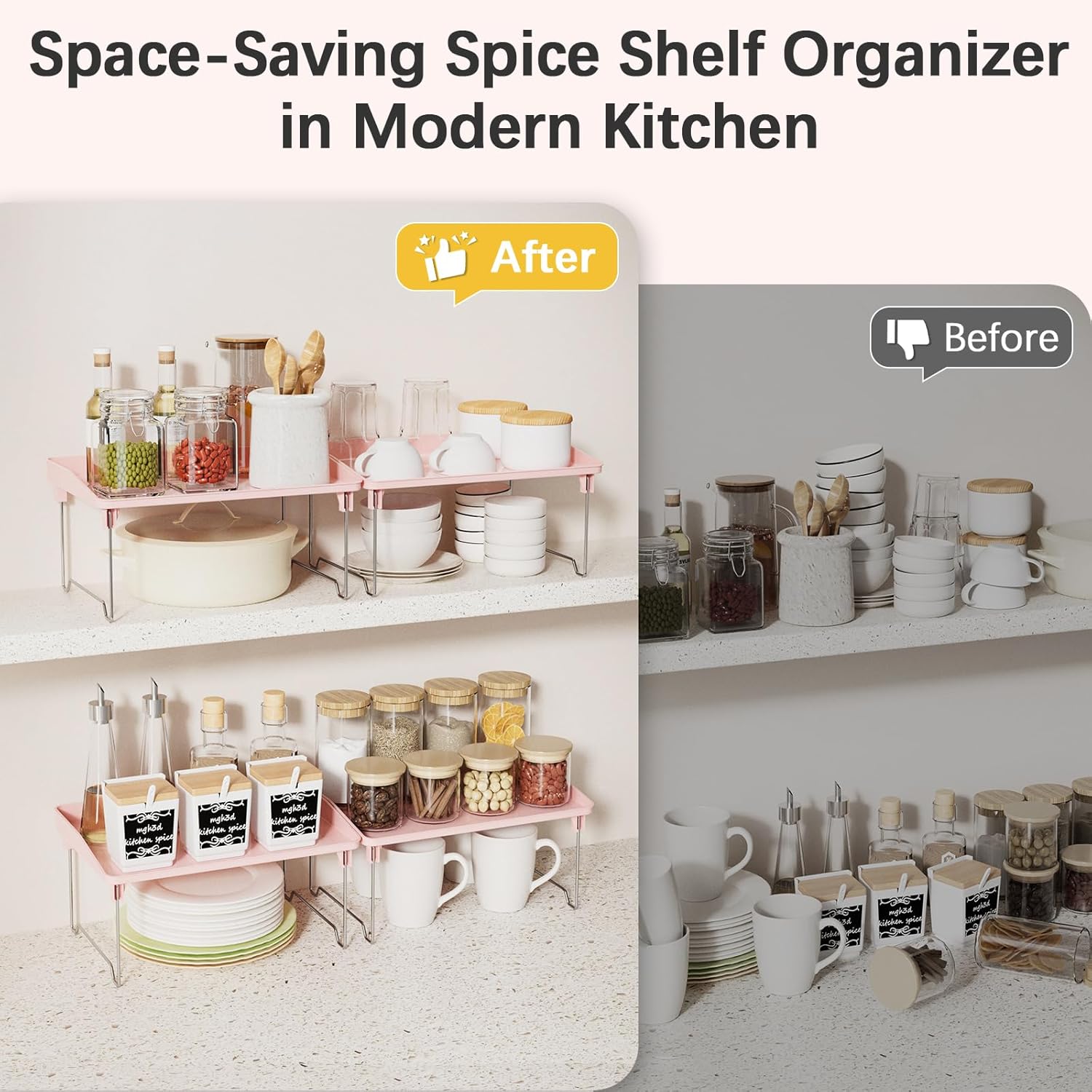 【Extra Space】With these spice organization for cabinet, you can instantly create extra space for storage. The double layer storage allows you to maximize the available vertical space, providing more storage options