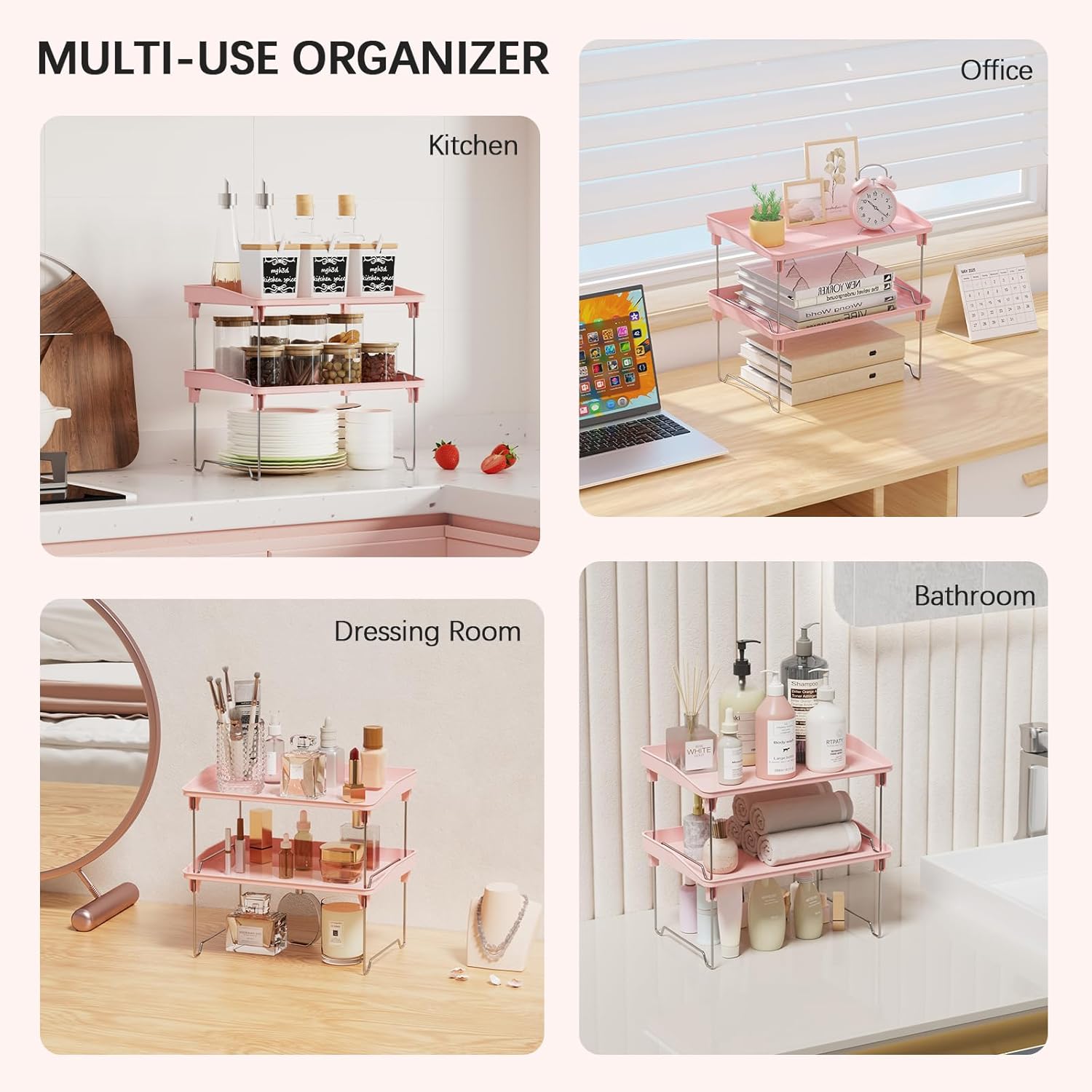 2 Pcs Cabinet Organizer Shelf,Stackable Kitchen Counter Shelves, Spice Rack,Countertop Organizers,Pink Plastic Storage Shelves Rack for Makeup,Bathroom, Cupboard,Desk,Pantry Organization