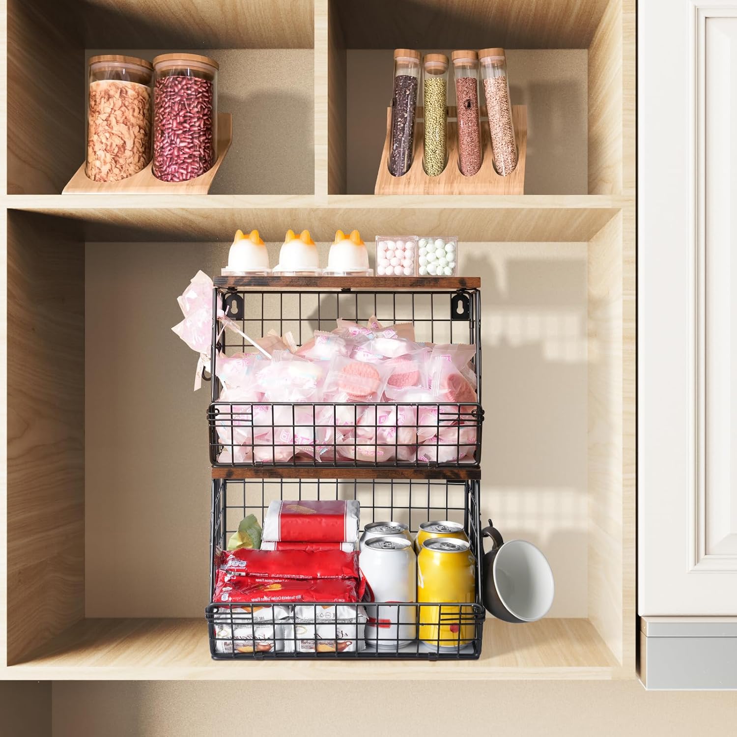 Package and Size: 2 Stacking storage baskets with wood lid, Suitable for countertop organizer, pantry organizer, snack organizer, fruit and vegetable storage etc. Kitchen countertop organizer size: 11.8 inch x 7.9 inch x 8.5 inch