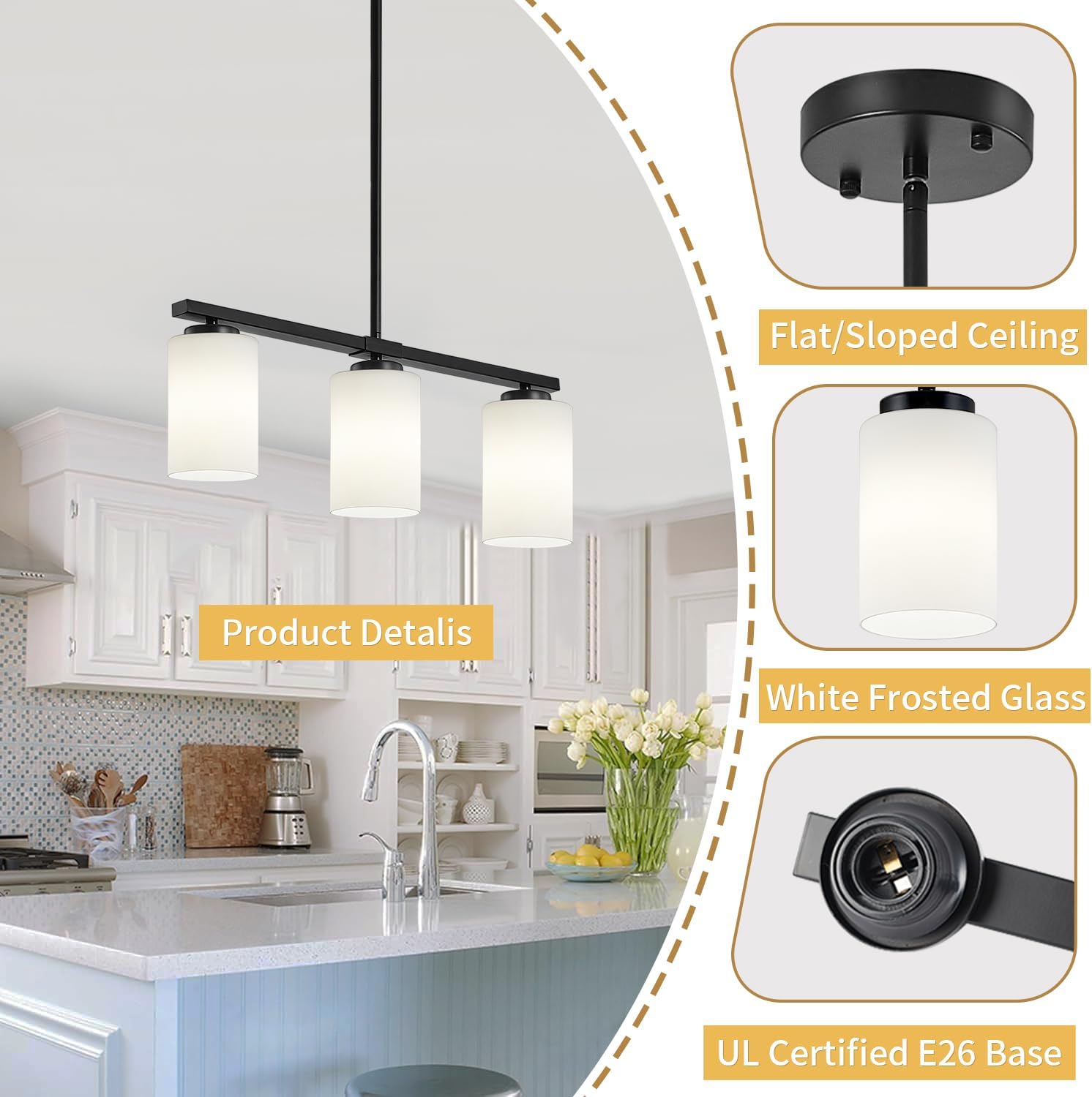 💡【SUPERIOR BRIGHT & WARM ATMOSPHERE】Our dining room light fixtures featuring 3 E26 sockets, this kitchen island chandelier provides ample, evenly distributed light for meal prep and family gatherings. The frosted glass diffuses light to eliminate glare, creating a warm and comfortable ambiance for any occasion.