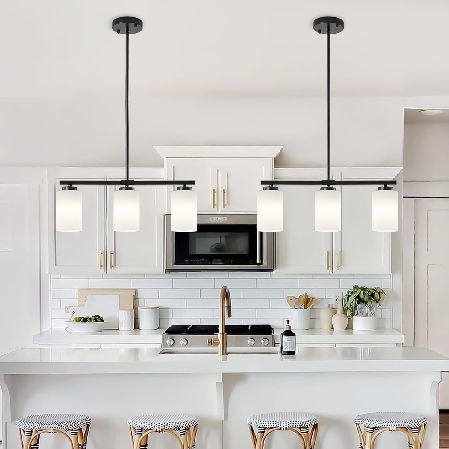 💡【3 LIGHTS KITCHEN ISLAND LIGHT】Crafted with premium metal and milky white frosted glass shades, this linear chandelier emits a soft, inviting glow. It transforms your kitchen island lighting into a modern and elegant space, becoming the stunning focal point of your home.