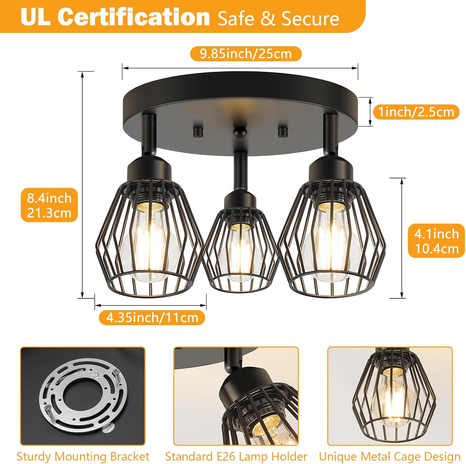 Wide Applications: The black flush mount ceiling light with upgraded metal cage shapes to match the vintage appearance. This light fixtures ceiling mount can be used as kitchen ceiling light fixtures, hallway light fixtures, farmhouse light fixtures, dining room light fixtures, bedroom ceiling light, entryway light fixture, adding more fun to your home!