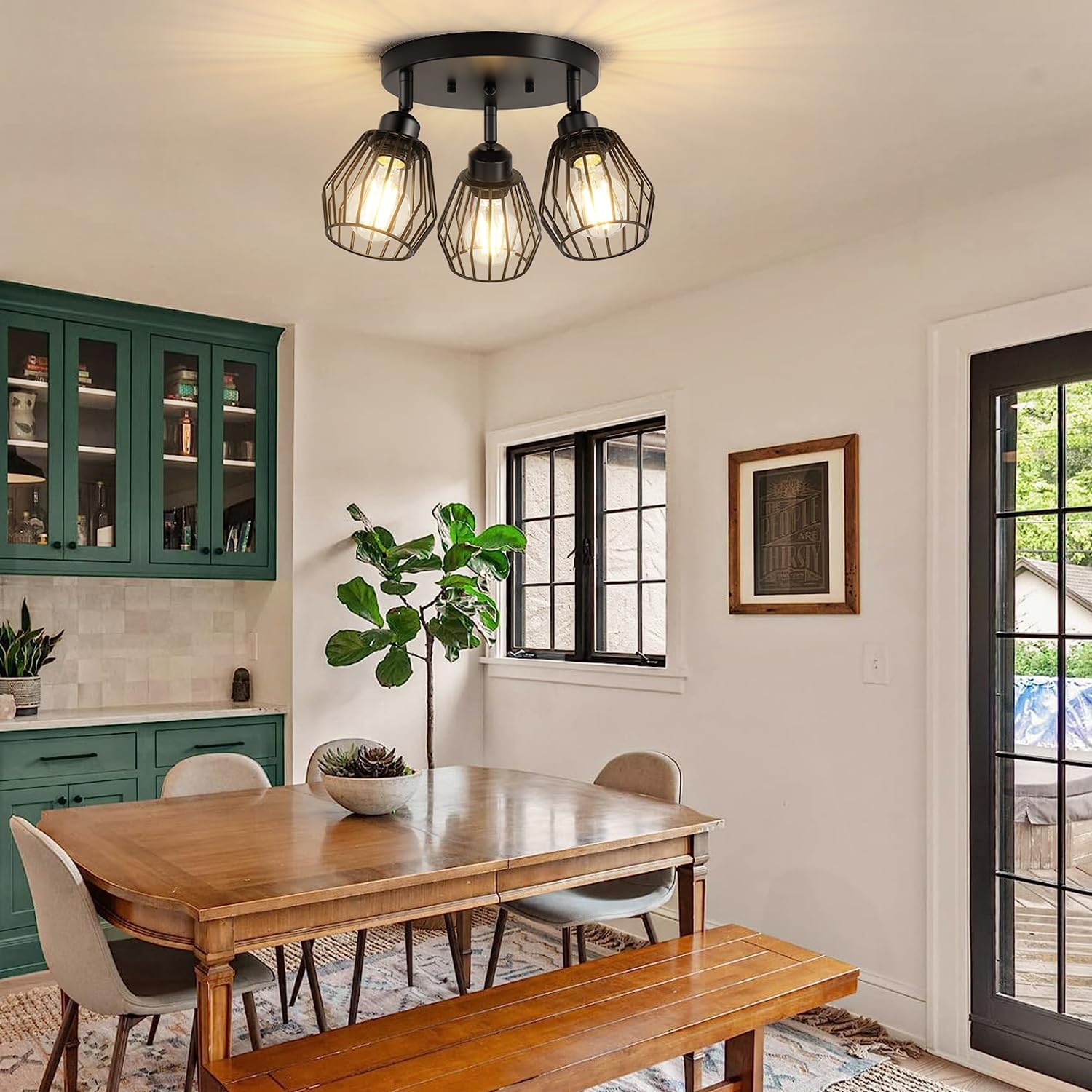 3-Light Kitchen Light Fixtures Ceiling Mount, Adjustable Multi-Directional Farmhouse Black Metal Cage Flush Mount Ceiling Light Fixtures for Hallway Dining Room Entryway