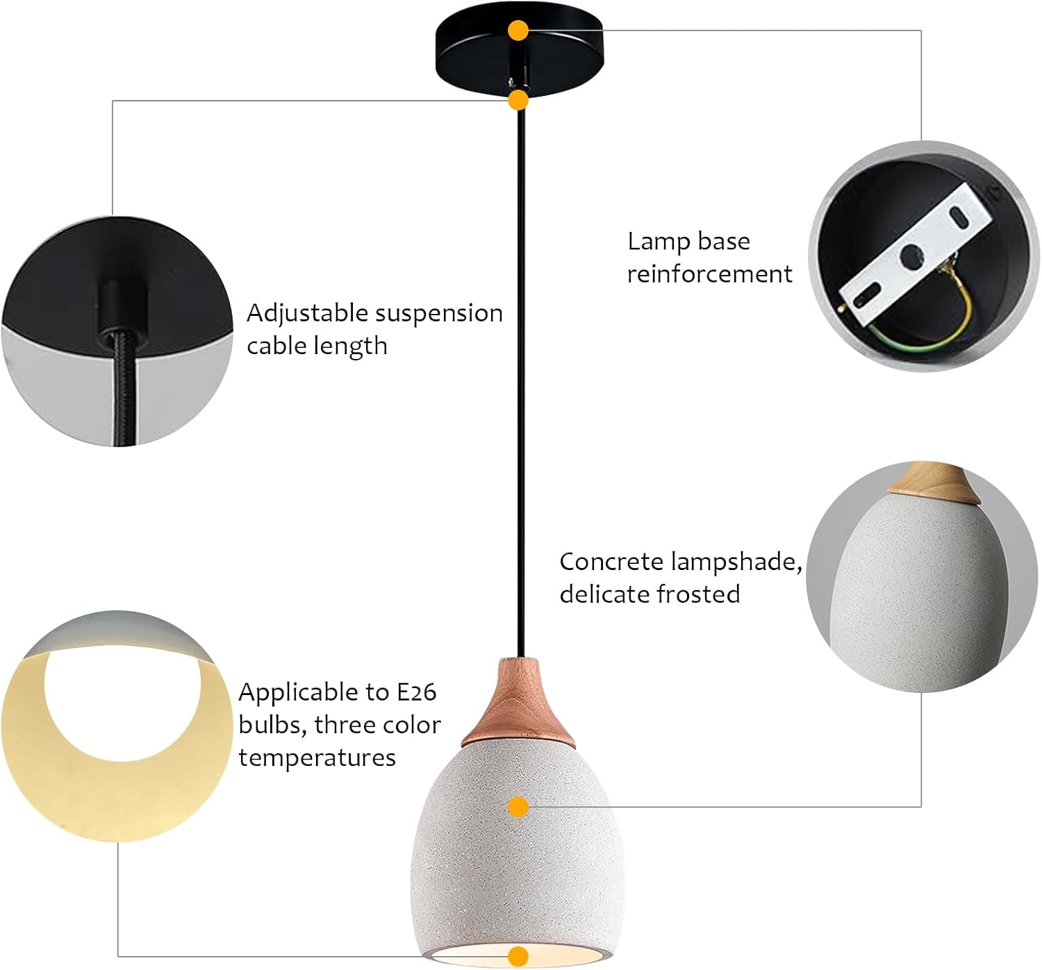 【Material & Specifications】 Pendant Light overall height: 78.74 inch, Concrete and Wood: H9.25 inch x D5.75inch, Ceiling base: 3.15 inch x1.18 inch; Adjustable cord: Max 78.7 inch.